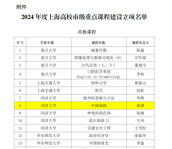 近日,上海市教委发布了2024年度上海高校市级重点课程立项名单,由公司徐蓉教授担任课程负责人的《中国道路》喜获上海高校市级重点课程立项。上海市级重点课程立项是上海市高等教育质量提升工程的重要组成部分,旨在通过项目引领,推动高校课程体系的优化与升级,提升课程教学质量和育人水平。