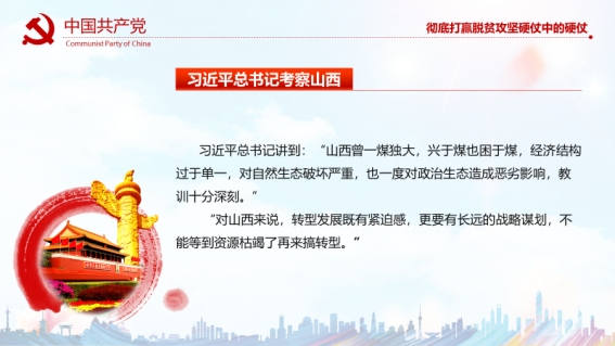 浙江余村和云南怒江州人民生态脱贫,生态致富的例子,我们不禁思考我们的家乡能否像他们一样利用生态环境实现脱贫,实现致富。宣讲员从习总书记对山西的评价开始谈起,以扶贫攻坚造林专业合作社进一步讲到山西省委省政府在近几年转型跨越发展中的努力。